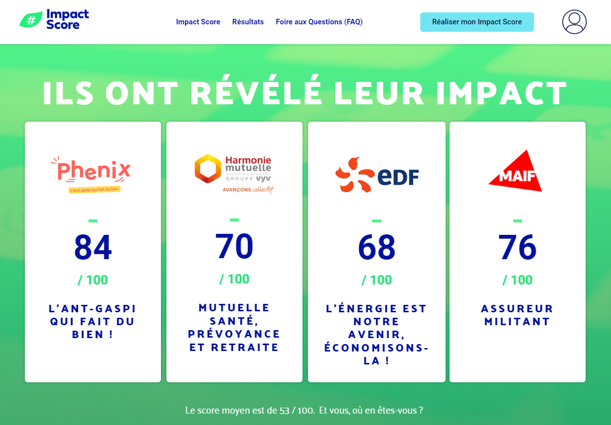 Pilotés par le Mouvement Impact France, 30 réseaux d’entreprises engagées ont identifié une base commune de 20 indicateurs pour construire l’Impact Score. Face aux nouvelles réglementations et à la multiplication des labels, l’Impact Score est le référentiel commun construit par et pour les entrepreneurs et dirigeants. Il permet à toute entreprise de s’évaluer, en 2h, sur son impact social et écologique à 360° et de rendre visible son niveau de progression.